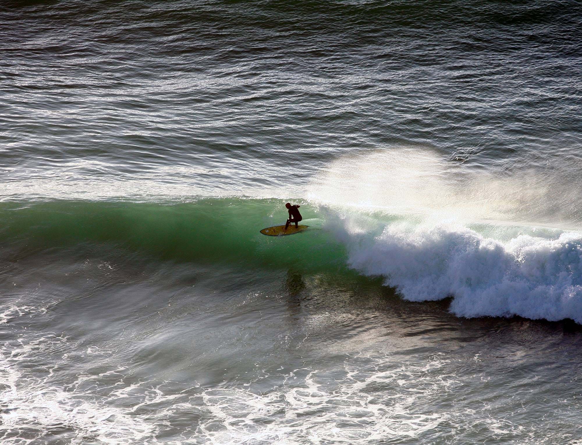 It’s considered Cornwall’s most exciting big surf wave, and for good reason. It’s a rarity, so it offers huge bragging rights and it’s unpredictable. The Cribbar is the reef that runs under the water from the Towan headland. It’s shallower than the surrounding sea and when the right swell comes in it breaks over the reef. Because there’s a relatively shallow reef surrounded by sand, there is a gradient underwater and it’s not uniform like the beach, so the waves peel off it, rather than closing out.